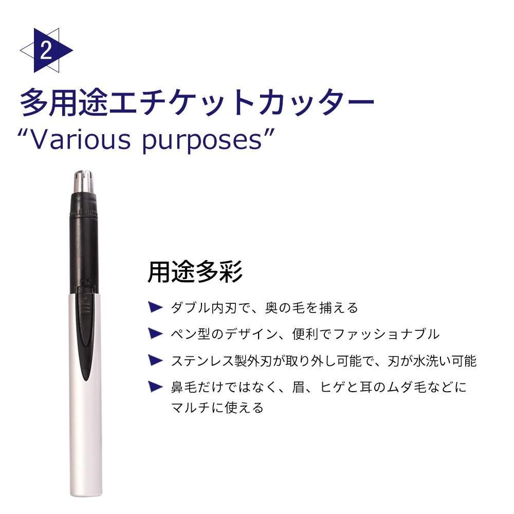 ✅本体は軽量アルミ製、切断刃は高品質で信頼性の高いスウェーデン鋼と日本鋼を使用。 ✅ペンとほぼ変わらない超スリムサイズなので、どこへでも気軽に持ち運べます。 ✅モーターには日本の大手有名メーカー製品採用し、優れた耐久性を誇ります。 ✅丸型安全除毛ヘッドを採用し、肌を傷つけることもなく、上から入る毛もカットします。 ✅サイズ:長さ14.5cm×幅1.3cm 重さ:19g 付属品:専用掃除ブラシ、取り扱い説明書(日本語)