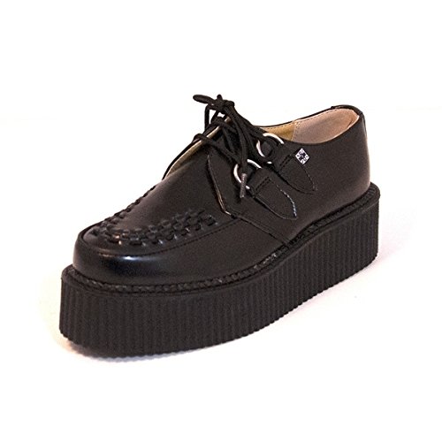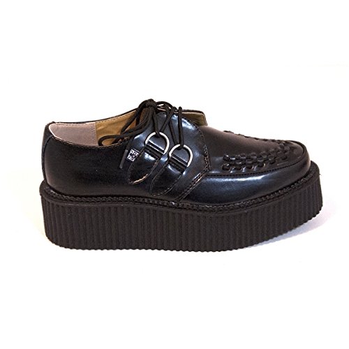 Studio : T.U.K. Publisher : T.U.K. Binding : Apparel Amazon.com Product Description Need to dress up in a suit, but allergic to wingtips or pumps? Here's an alternative. The T.U.K unisex Interlace Creeper is pure class on an elevated rubber creeper sole. The shoe is elegantly constructed of black leather, with bold black piping outlining the vamp, which is further decorated with an interlaced border of black-on-black leather. Use the round black laces to close the throat with the D-ring eyelets, or subvert the paradigm with your own colorful laces.