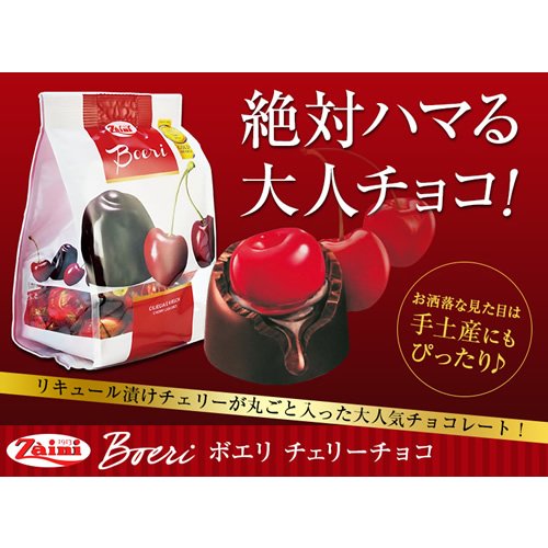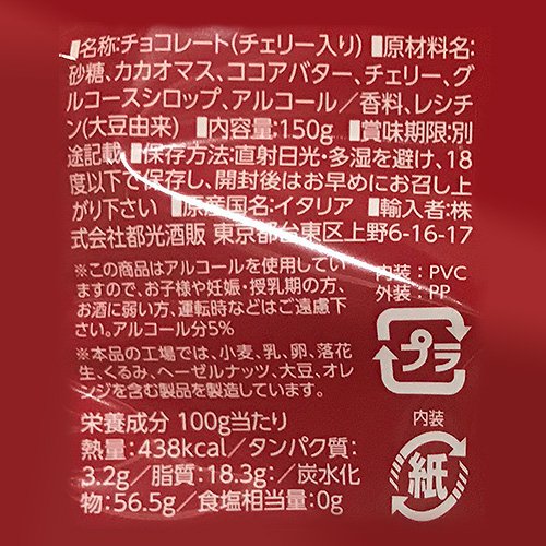 原材料:砂糖、カカオマス、ココアバター、チェリー、グルコースシロップ、アルコール、香料 / 乳化剤(大豆レシチン)