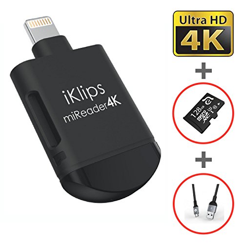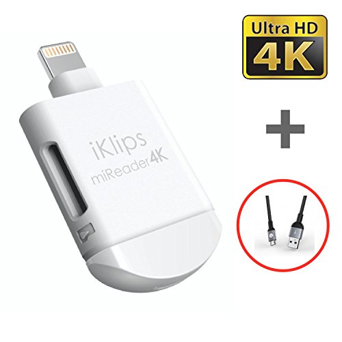 Introducing the iKlips miReader 4k Lightning / Micro USB 3 in 1 microSD card reader ´ 13cm Premium Aluminum Reversible Micro USB Braid Cable ´ The best iPhone/iPad 4K Card Reader with extended storage on the go. ´ Lightning / Micro USB / microSD card 3-in-1 connector - Transfer and charge at the same time. Easily share les between iOS, Mac and PC. ´ Apple MFi Certifed (Made for iPhone/iPad/iPod) ´ Record 4K video and shoot high quality raw photos directly to iKlips miReader 4K, bypassing the iPhone or iPad internal memory. ´ MicroSD reader supports up to 256GB cards. Easily switch microSD cards with your Android smart phone. ´ Supports exFAT format allowing you to transfer single files larger than 4GB. ´ Works with your GoPro, Micro Drone, Dash Cam, even your Pro DSLR Camera. ´ Instantly transfer all your 4K video to an iPhone/iPad Pro for playing and editing on the go and on a larger screen. ´ Ultra fast technology support up to 80 MB/s for Micro USB and Lightning 30 MB/s (subject to your microSD card). ´ Passcode Touch ID support, the worldÍs first iKlips app for macOS and Windows to let you easily lock/unlock files in any platform you prefer. ´ Backup, view, transfer, capture & manage all your photos, music, videos, documents directly from iKlips miReader 4K. File Compatibility : Video: .mp4, .mov, .m4v(without DRM), .mkv, .avi, . v, .rm, .rmvb, .wmv, .vob, .3gp, .gif, .swf Audio: .mp3, .aac, .aif, .ai , .wav, .m4a, .caf, .wma, .ape, . ac, .d Image: .jpg, .tif/.ti , .gif, cr2, .dng, .nef, .bmp, .ico, .png, .iiq Document: .pages, .numbers, .key, .doc/.docx, .xls/.xlsx, .ppt/.pptx, .rtf, .txt, .htm/.html, .pdf, .vcf, .zip, .psd, .pps, .phpFeature