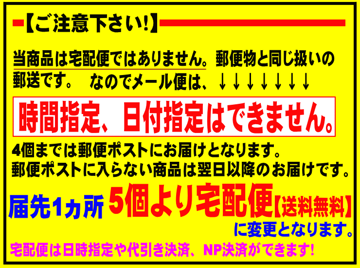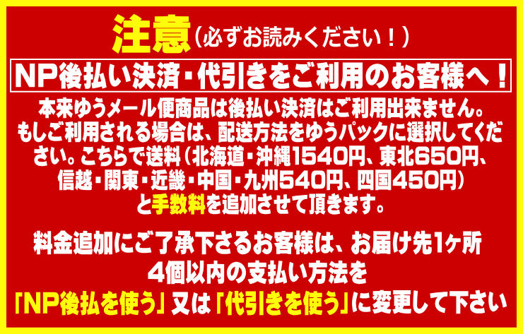 本来メール便商品では、NP後払い決済・代引きがご利用出来ない為、宅配便に変更になります。お届け先1ヶ所4個以内の場合、送料(北海道・沖縄1540円、東北650円、信越・関東・近畿・中国・九州540円、四国450円)と手数料が必要になります。