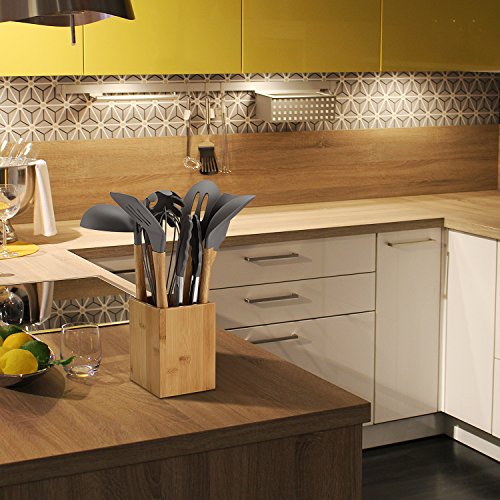 ★ SPECIAL HAND-MADE CRAFTSMANSHIP: This Silicone kitchen utensils are all hand-made with special, delicate craftsmanship. And the big hanging holes as well as the bamboo holder make it easier to store the utensils within convenient reach.
