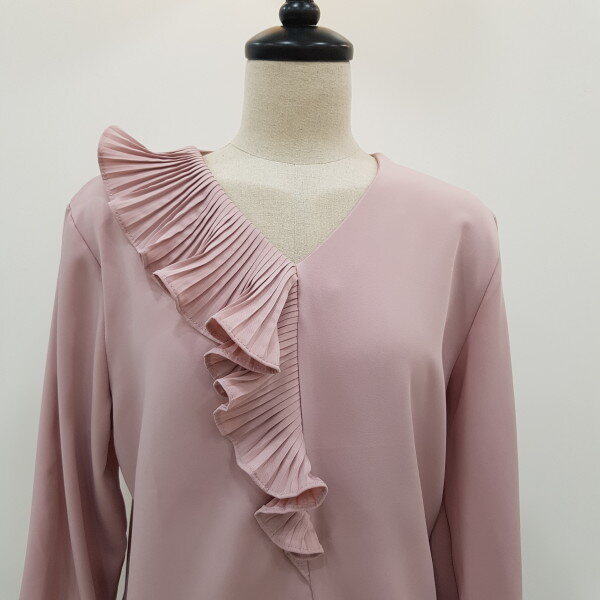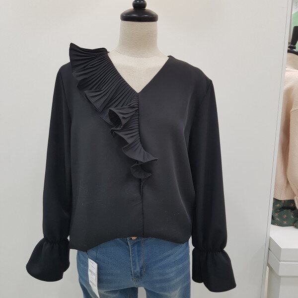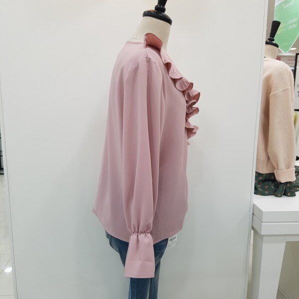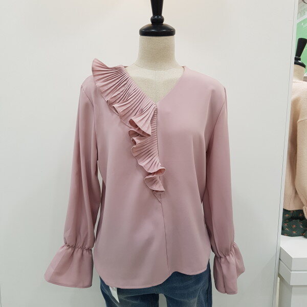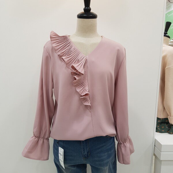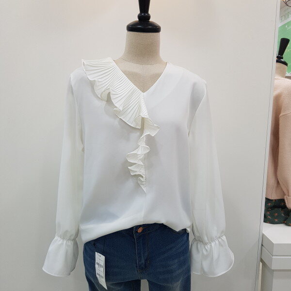 브이넥과 러플이 실루엣을예뻐보이는 효과를주는 블라우스입니다