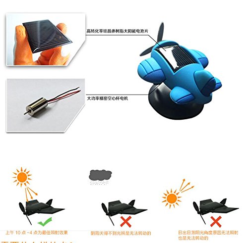 How to play: This cute mini solar panel model works in sun power. Place the model in directly sunlight, and give the propeller a gently push, it will active and start to charming you. Please be attention, it can't run in cloudy or rainy day . No power storage function, and no work in night. The running last-time of every launch will be different, even that it may stop automatically according to sun power decrease or sun position angle change. It's not product damage or defective, it's related to sun.