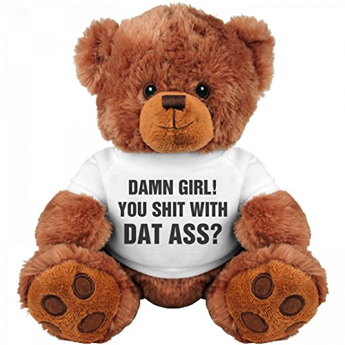 -. Feature : Custom made and P.R.Inted on demand when ordered. / Sits roughly 8 inches high. / Super soft fur. Soft embroidered eyes and nose. / Mini t-shirt is removable. / Damn girl! You shit with dat ass? Uhhh. Yes. I do. You're not that good with pick up lines are you? Give your valentine's day crush this funny and dirty teddy bear and see if she feels the same about you.