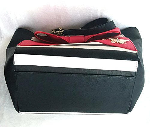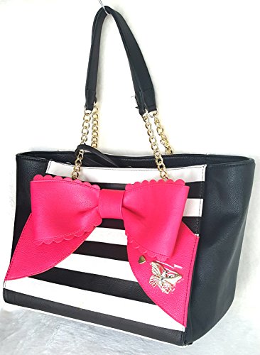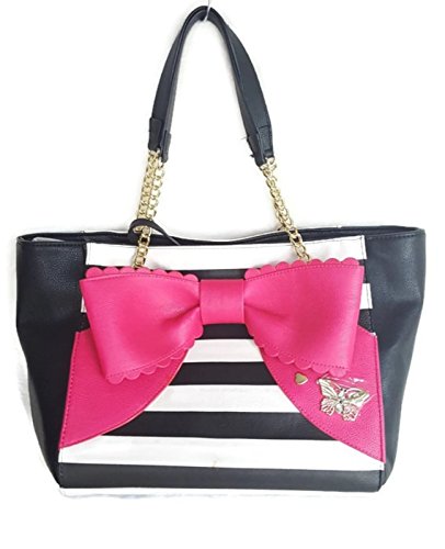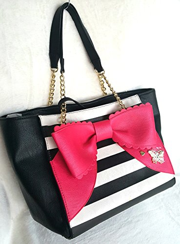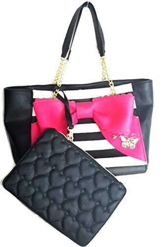 Bag with a Removable Black Pouch. Overall PU Body w/Black-White Striped Front & Back, Black on sides. Front has a Big Fuchsia Color Bow with goldtone butterfly & heart-shaped studs. Back side Bottom has a gold tone Betsey Signature Name plate. Both Bag & Pouch has Inner Polyester Floral Signature Lining. Closure:Magnetic Snap(Bag),Zipper(Pouch). Dual Chain-Leather Shoulder Strap has 9.5"drop. Bag Measures:Length:(Top:17",Bottom:13") x Height:10.5" x Depth:8.5". Pouch:Length:10" x Height:7"