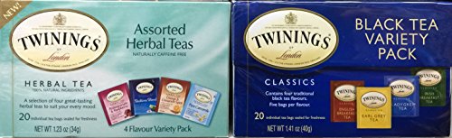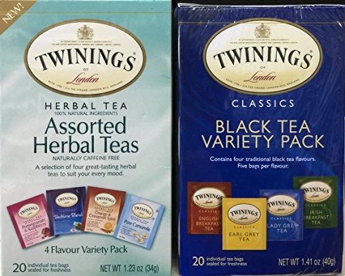 -. Binding : Misc. -. Brand : Twinings -. EAN : 0000675674896 -. Feature : A selection of eight different blends to suit every mood: Pomegranate and Raspberry, Nightly Calm, Orange and Cinnamon Spice, Pure Camomile, English breakfast, Earl Grey, Lady Grey and Irish breakfast teas / Expertly blended to create a perfect cup every time. Wide variety of delicate to full-bodied teas. / 40 Tea Bags / Includes Our Exclusive HolanDeli Chocolate Mints -. NumberOfItems : 2 -. PackageQuantity : 4 -. ProductGroup : Grocery -. ProductTypeName : GROCERY -. Title : (Pack of 2) Assorted Herbal and Black Tea, Variety Pack(8 Flavors). Includes Our Exclusive HolanDeli Chocolate Mints. -. UPC : 000675674896