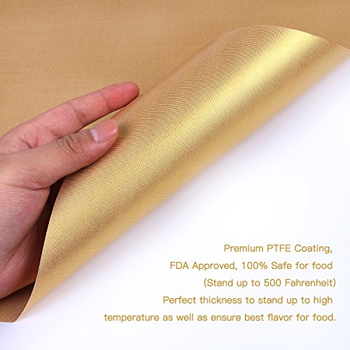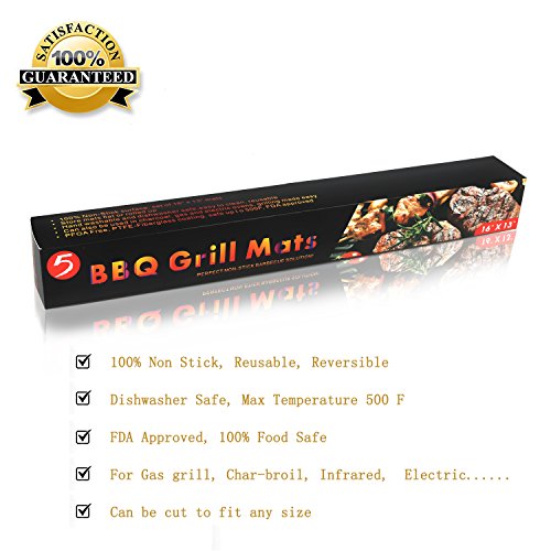 - TOP QUALITY MATERIAL - Our BBQ mats are make from 100% PFOA-Free materials and premium non stick PTFE coating (FDA approved). With proper care, they can last for years to come. Don’t risk your family and friends’ health, ELIMINATE old burned meat on your grill. Our grill mat has the perfect thickness, keep grill marks and flavor intact while provide the ultimate heat resistance (up to 500 Fahrenheit) and durability.