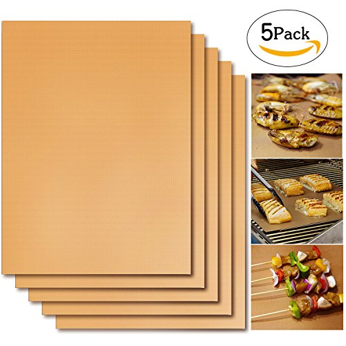 Gold Grill Mat Set of 5 100% Non Stick BBQ Grill & Baking Mat Reusable Easy Clean 16"x13" For Gas Charcoal Electric Grill and More - FDA Approved PFOA Free Dishwasher Safe