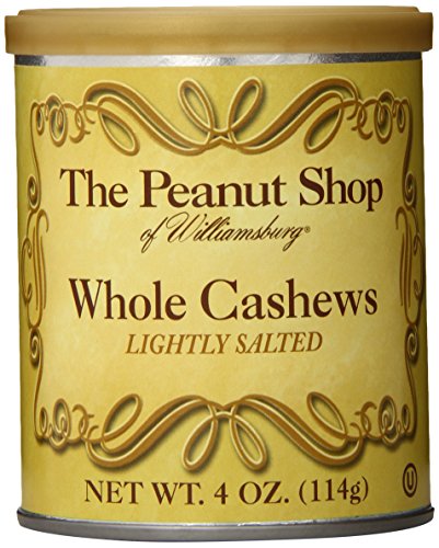 -. Binding : Grocery -. Brand : The Peanut Shop of Williamsburg -. EAN : 0053136892704 -. Feature : Distinctively unique and different And unbelievably crisp / Our selection of mixed nuts are always a winning combination / Try a tin for yourself and give several as gifts to those you wish to receive the finest -. Label : The Peanut Shop of Williamsburg -. Manufacturer : The Peanut Shop of Williamsburg -. NumberOfItems : 1 -. PackageQuantity : 1 -. ProductGroup : Grocery -. ProductTypeName : GROCERY -. PublicationDate : 2012-04-26 -. Publisher : The Peanut Shop of Williamsburg -. Size : 4 Ounces -. Studio : The Peanut Shop of Williamsburg -. Title : The Peanut Shop of Williamsburg Whole Cashews, 4-Ounce -. UPC : 053136897204