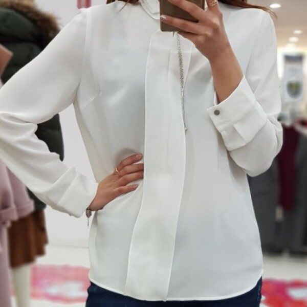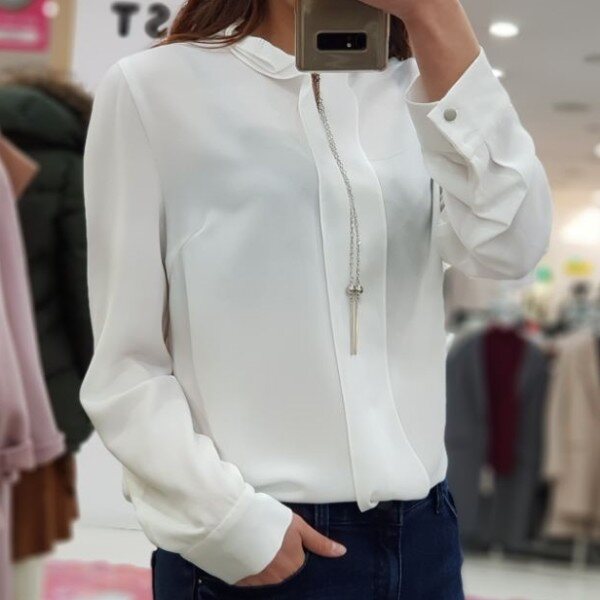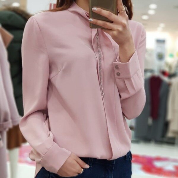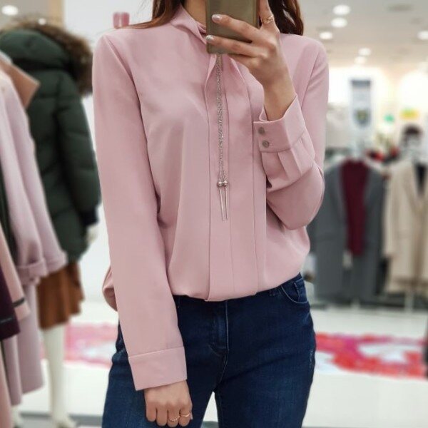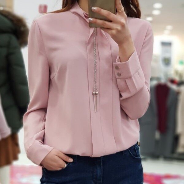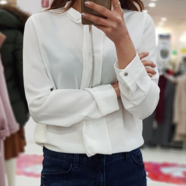 목걸이 장식과 하늘하늘한 소재가 돋보이는 고급스러운 블라우스입니다.단정하고 우아한 분위기라 오피스룩으로 좋은 상품입니다.