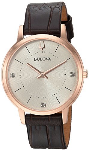 Genuine diamonds accent the face of this brilliant rose goldtone watch from Bulova. The embossed leather strap completes the look.