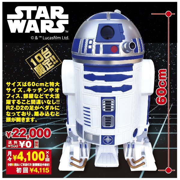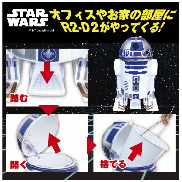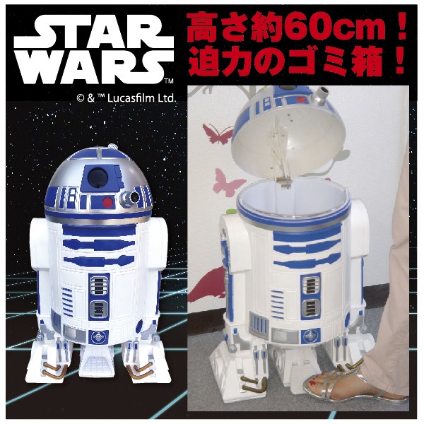 オフィスやお家の部屋にR2-D2がやってくる!きれいなお部屋もフォースと共に在らんことを。サイズは60cmと特大サイズ。キッチンやオフィス、部屋などで大活躍すること間違いなし!!2-D2の足がペダルになっており、踏み込むと頭が開きます。高さ約60cm!迫力のゴミ箱!!■サイズ:約(高)60×(高)40cm、内側バケツ直径22cm