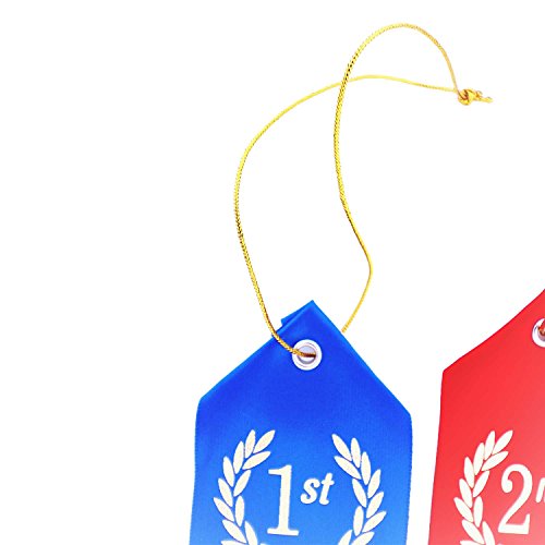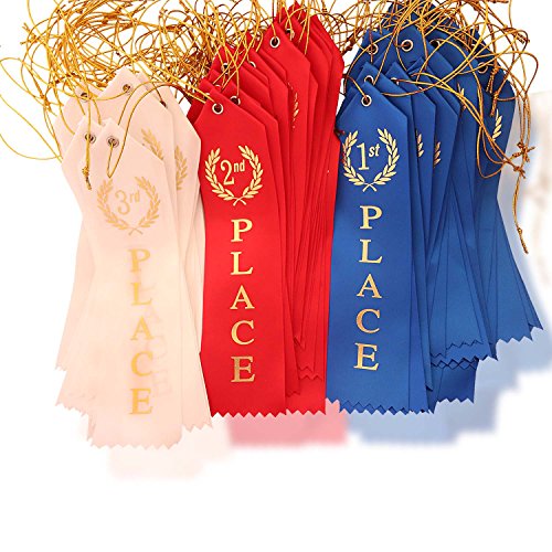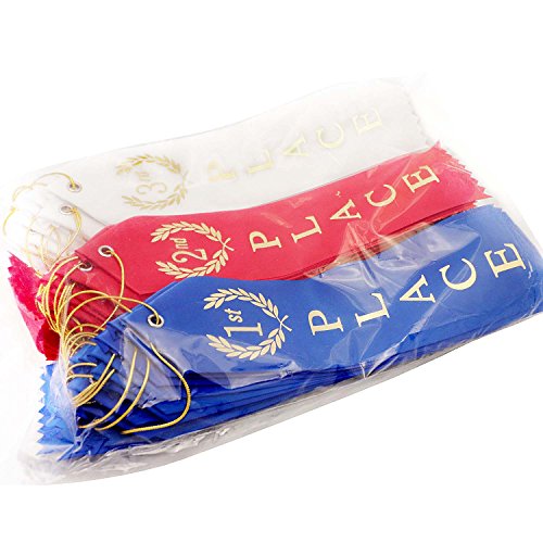 ??HOW TO HONOR SOMEONE MEANINGFULLY: You give out awards to recognize accomplishment and to make someone feel special. With California R & D Luxury Ribbons, the vibrant colorful ribbons invokes a sense of prestige and quality - that the giver took time out to sought out premium ribbons for the awardee. In addition, make someone feel extra special with the inscription you write on the back of the ribbon. The area for writing allows the awardee the opportunity to remember who gave him the award and what it was for. Gift an award that counts. An award you'd be proud to give - California R & D Ribbons. Made in the USA. ??VALUE BUNDLE PACK: Each bundle comes with a total of 90 ribbons: Thirty 1st place Ribbons (Blue), Thirty 2nd Place Ribbons (Red), and Thirty 3rd Place Ribbons (White) ??QUALITY PREMIUM RIBBONS: Made in the USA with nice soft fabric and vibrant colors. Pre-printed with bright metallic gold print. At the top is metallic gold string to attach the ribbon to trophies, entries, etc ??MULTIFUNCTIONAL:Suitable for handing out at school events like science fairs, athletic contests, spelling bees, camp, dog shows and more. They can also be used at costume contests and other competitions as award recognition. These multicolored ribbons feature a vibrant, modern design and an eyelet with string for tying on. A paper card on the back provides a space for writing the name of the event. ??ABSOLUTELY RISK FREE PURCHASE: Buy with confidence! Every Award Ribbon Bundle features our No-Questions-Asked, 30-DAY, Money-Back Guarantee. If you don't absolutely LOVE the Ribbons, within the first 30 days unused, we'll take it back, no questions asked! Simply click the "Add to Cart" button to order yours now while supplies last. STOCKS ARE LIMITED.