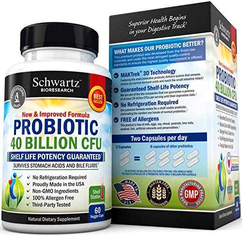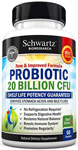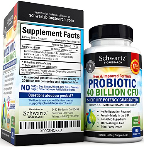 -. Binding : Health and Beauty -. Brand : Schwartz Bioresearch -. EAN : 0737212750903 -. Feature : Guarantee Potency for Entire Shelf Life: Most probiotics have weak strains that don't survive the shipping and storing processes, let alone stomach acids and bile. We are some of the very few who can guarantee potency, until the expiration date. / Amazing health benefits have been featured on the Dr Oz Show: Dr. Oz, recommends a daily dose of high-quality probiotics to repopulate the good bacteria in the body, which are usually destroyed through dieting and taking antibiotics. / Some of the many benefits of probiotics include: the increased production of vitamins, relief from allergies, gas, bloating, and constipation, and increased absorption of calcium for better bone density. Around 80% of our immune system is in our stomach, and when probiotics abound in our bodies, they make it harder for bacteria to settle in, thus boosting your immune system. / Each lot is extensively tested and third party certified: The potency, purity, and content of each batch of probiotics are extensively analyzed by professionals before its release. The ingredients in our products are 100% natural, and we use no binders or fillers of any sort. / Probiotics can help you lose weight: Adding 2 capsules a day of our probiotic supplement can further benefit your health in ways you would not believe. Weight loss and fat loss are, more often than not, added bonuses of taking probiotics regularly. -. IsAdultProduct : 0 -. Label : Schwartz Bioresearch -. LegalDisclaimer : * These statements have not been evaluated by the Food and Drug Administration. This product is not intended to diagnose, treat, or cure any disease. -. Manufacturer : Schwartz Bioresearch -. PackageQuantity : 1 -. ProductGroup : Health and Beauty -. ProductTypeName : HEALTH_PERSONAL_CARE -. Publisher : Schwartz Bioresearch -. Size : 60 -. Studio : Schwartz Bioresearch -. Title : Top Quality Probiotics 20 Billion CFUs 60 capsules - Shelf stable, Developed by Doctors, Guaranteed Potency until Expiration. Gluten Free Probiotic. Made in USA - Money Back Guarantee -. UPC : 737212750903