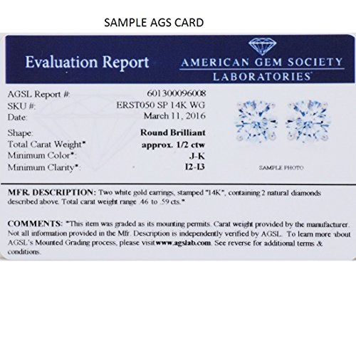 -. Binding : Jewelry -. Brand : Amanda Rose Collection -. Department : womens -. Feature : 1/2ct total weight in 14K White Gold / Black Velvet Earring Box Included / AGS ( American Gem Society Certificate Included) / All of our diamond suppliers state to the best of their knowledge that any diamonds supplied to MLG are conflict free. -. Label : Amanda Rose Collection -. Manufacturer : Amanda Rose Collection -. Model : PDE50AWGBASKZAGS -. MPN : PDE50AWGBASKZAGS -. PackageQuantity : 1 -. PartNumber : PDE50AWGBASKZAGS -. ProductGroup : Jewelry -. ProductTypeName : FINEEARRING -. Publisher : Amanda Rose Collection -. Studio : Amanda Rose Collection -. Title : AGS Certified 1/2ct tw.Round Diamond Stud Earrings set in 14K White Gold