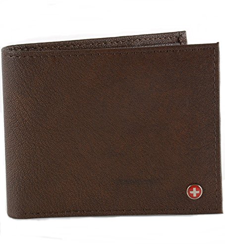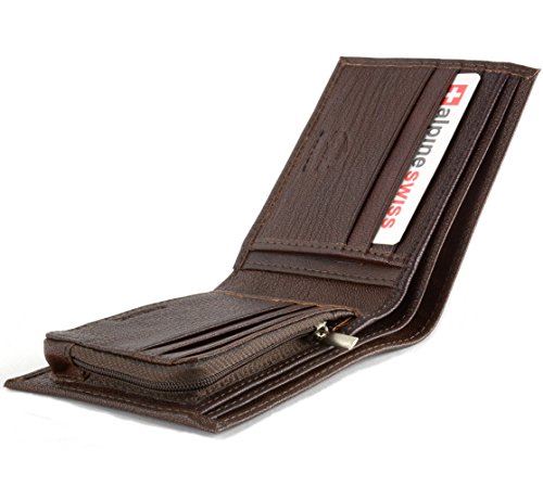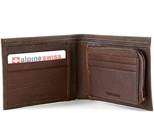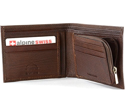 Men's Leather Coin Purse WalletBy Alpine SwissMSRP: $49.50Product Features:Measures: 4 3/4" x 3 7/8" x 1" Bifold Wallet with an inside Coin Purse Zipper ClosureAlpine Swiss Cross Logo outside6 Regular Card Slots3 additional oversized card/ receipt slots Two divided bill sections to allow separation of large and small billsGenuine Leather - Semi Glossy Soft Lambskin Leather