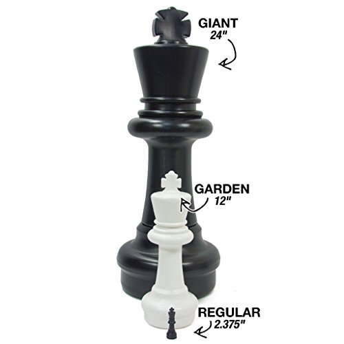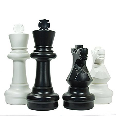 Studio : Uber Games Publisher : Uber Games Binding : Misc. Product Description The Giant Chess Game Pieces Set by Uber Games is a traditional game of chess but built in a new and giant way. These giant chess pieces are made from a thick, durable PVC plastic, are waterproof, UV protected and built to last. Each giant chess piece weighs in at just over 2 pounds and measures in height between 16.5 inches (pawn) to 24 inches (king) with a 8.75 inch diameter base. The base of each giant chess piece unscrews and opens so that you can fill the base with water or sand to increase stability; especially helpful for the beach or other windy events. Giant chess is perfect for outdoor parties, shopping centers, wedding receptions, or set this giant chess game up at the beach or the park and draw a crowd! Not only does the Uber Games Giant Chess Game Pieces Set look impressive, it also allows players of all ages to learn and enjoy chess in a unique giant way. The Giant Chess Game Mat by Uber Games is made of sturdy nylon with metal grommets in each corner. It also includes (4) metal stakes to secure your mat to the ground and (1) nylon carrying bag. Each square on the mat measures 12.5 inches by 12.5 inches. The total area used by the Giant Chess Mat measures 9 feet by 9 feet. This nylon mat can be easily unrolled and set up and then rolled back up for easy storage. Great for outdoor and indoor play. This is a lightweight alternative to the Giant Chess Game Board and is perfect for use with a Giant Chess Game Pieces set. 0