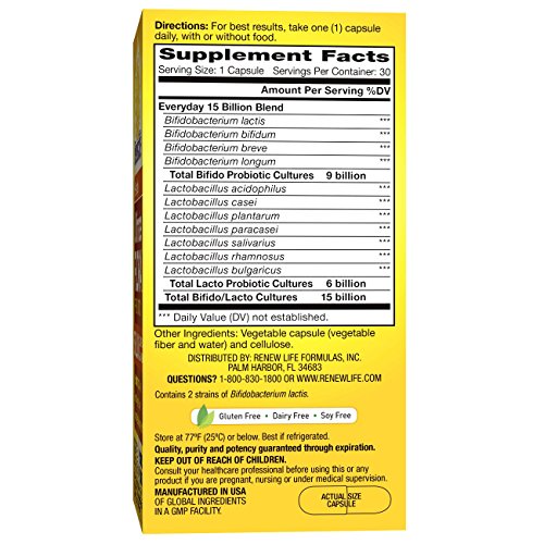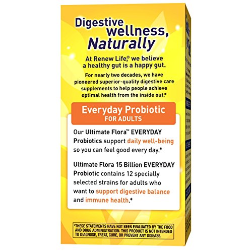 ReleaseDate : 2015-08-05 Studio : Renew Life Publisher : Renew Life Binding : Health and Beauty Product Description Ultimate Flora Everyday Probiotic 15 Billion is a high-potency formula with 10 scientifically studied Bifidobacterium and Lactobacillus strains. This daily probiotic supports digestive and immune health so you feel better, lighter, and more energized. These statements have not been evaluated by the Food and Drug Administration. This product is not intended to diagnose, treat, cure, or prevent any disease. * These statements have not been evaluated by the Food and Drug Administration. This product is not intended to diagnose, treat, cure, or prevent any disease. 0