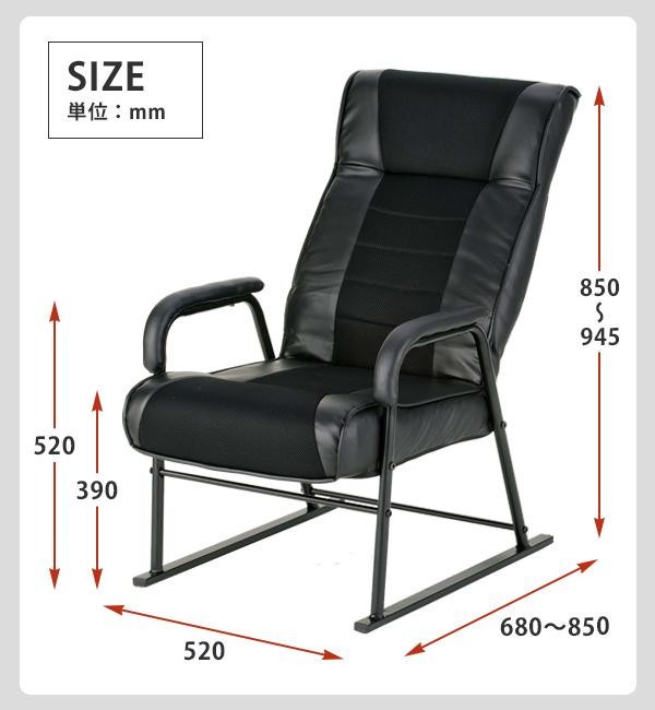 | サイズ | W520×D680~850×H850~945mm、座面高さ:390mm、肘掛け高さ:520mm 個装サイズ:66×29×54cm |