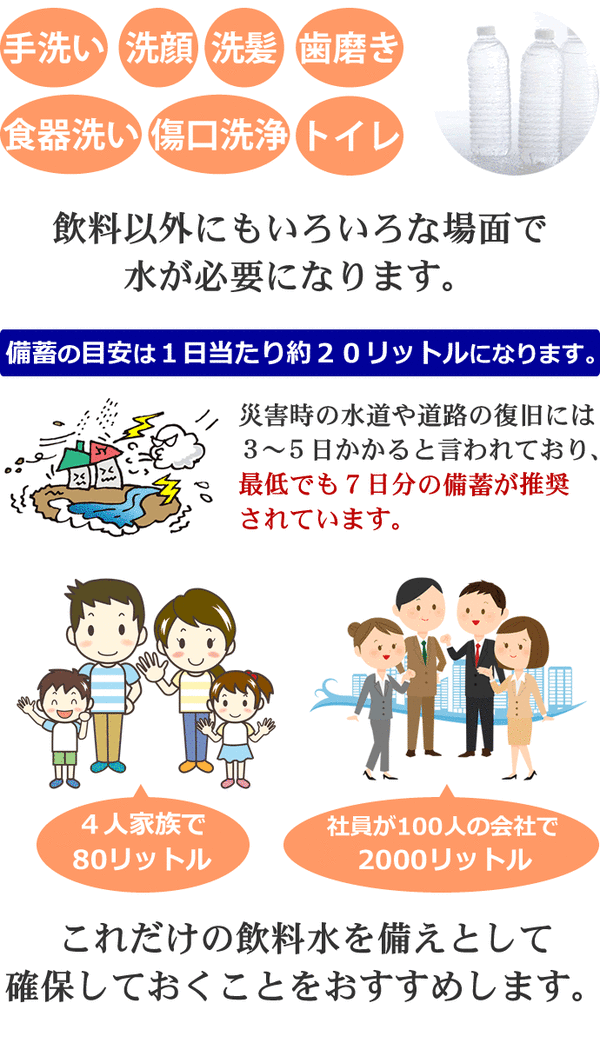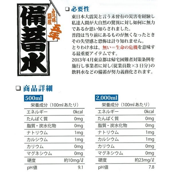 長期保存用ミネラルウォーター、軟水、避難グッズ、防災グッズ、避難用品、防災用品、保存食、2リットル、500ミリリットル、ほぞんすい、びちくすい、ちょうきほぞんすい