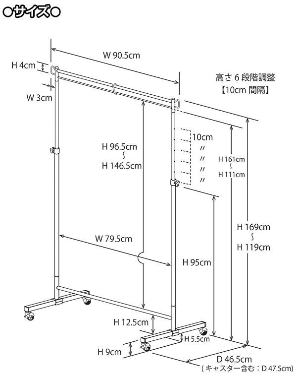 | サイズ | W90.5×D47.5×H119~169cm(キャスター含む) 個装サイズ:94×18×9cm |