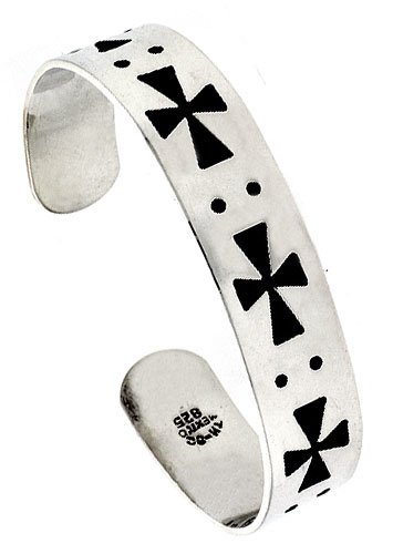 This Sterling Silver Cuff Bangle Carries the Maltese Cross Design. It's about 5/8 inch (14mm) wide. The Bracelet Is Flat with the Crosses carved out. It's well polished with antiqued background to show details on the pattern. It has a solid feel to it and the quality is excellent. It is a perfect gift for your friends and family.Feature