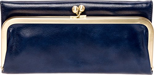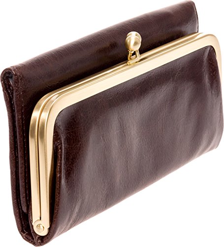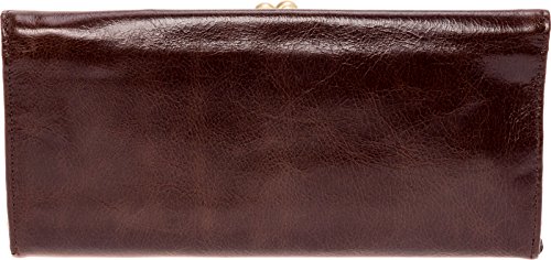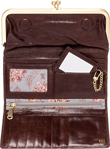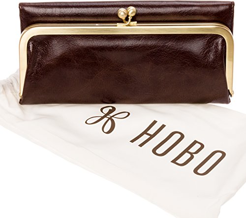 Superbly mixing class and function, this beautiful Rachel Clutch Wallet by Hobo transitions perfectly from day to night! Hobo is all about making stylish yet purposeful women's leather accessories and this wallet is no different. This clutch is made from top-grain leather which has been extra tumbled for a unique, broken-in vintage look and shine. This fully lined clutch has a large exterior pocket with a brushed finish metal kiss lock closure. The interior features 8 card slots, 3 currency pockets, 1 clear ID window, 1 zippered coin pocket, and a slip pocket with a cosmetic mirror. Show off your vintage style with this gorgeous clutch! Measures 8.25" x 3.75" x 1.5", folds out to 11.25" wide.Feature