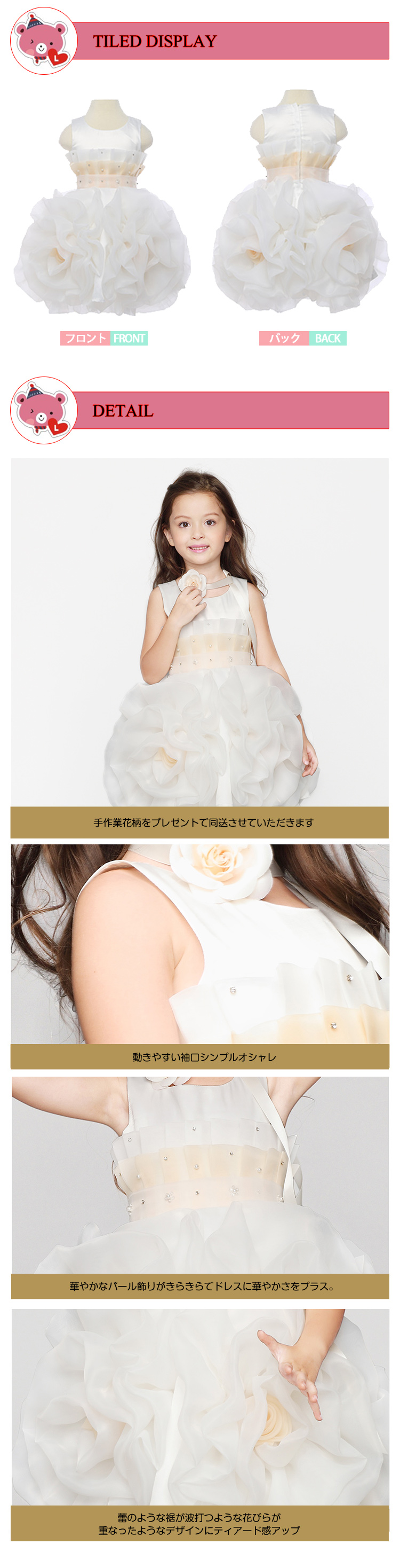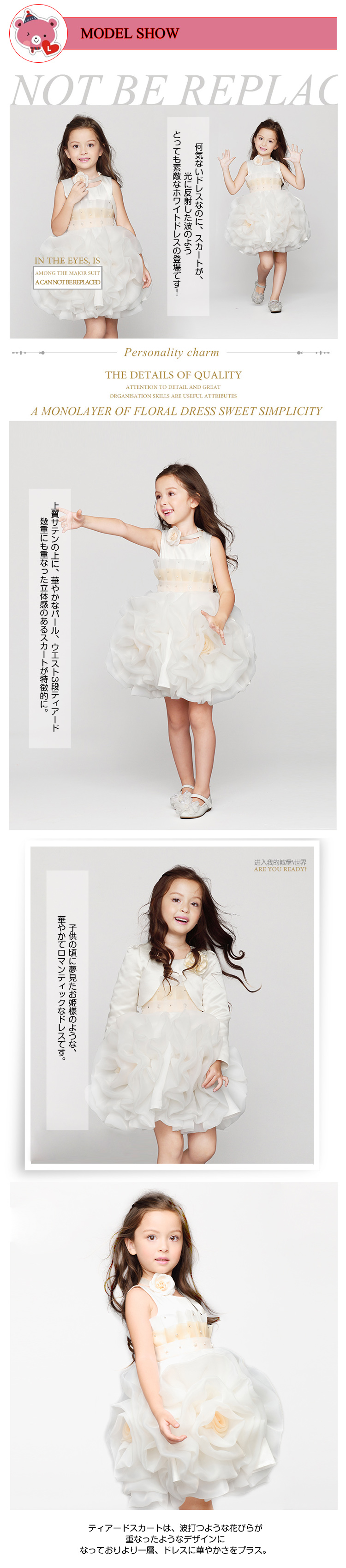 | 何気ないドレスなのに、スカートが、光に反射した波のよう!とっても素敵なホワイトドレスの登場です!上質サテンの上に、華やかなパール、ウエスト3段ティアード幾重にも重なった立体感のあるスカートが特徴的に。子供の頃に夢見たお姫様のような、華やかでロマンティックなドレスです。ティアードスカートは、波打つような花びらが重なったようなデザインになっておりより一層、ドレスに華やかさをプラス。立体感が華やかですが、すっきりとした雰囲気。かわいらしすぎるドレスが苦手なお嬢様にもオススメですよ。 | |