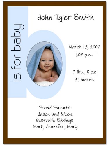 Product Description Birth Announcements: "B is for Baby Boy" features a clean and contemporary design where your adorable baby's face is placed in the oval part of the blue colored letter 0