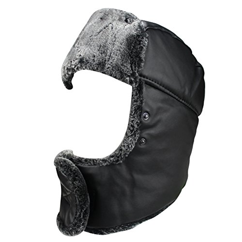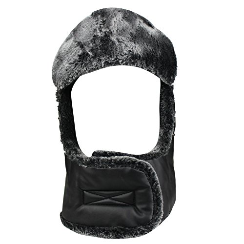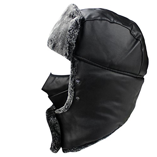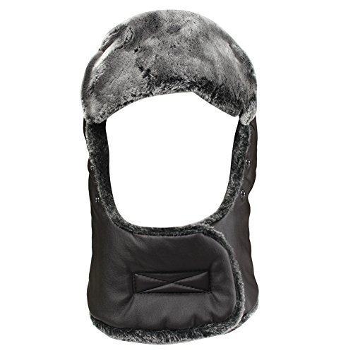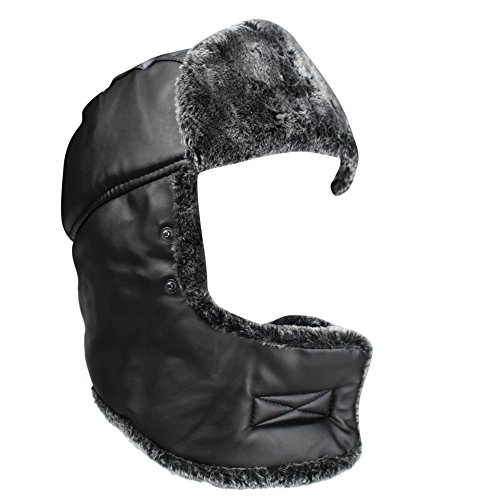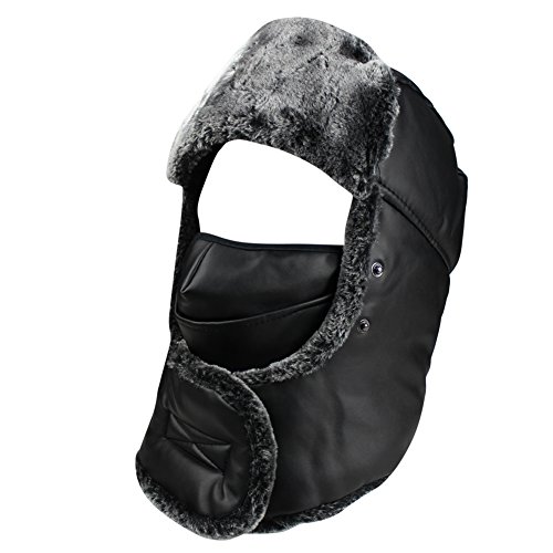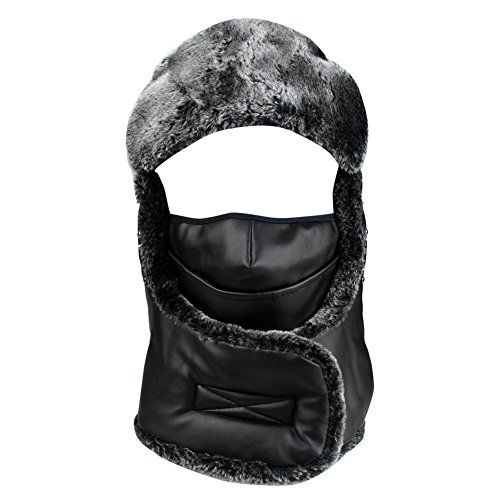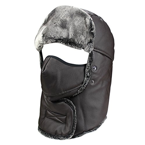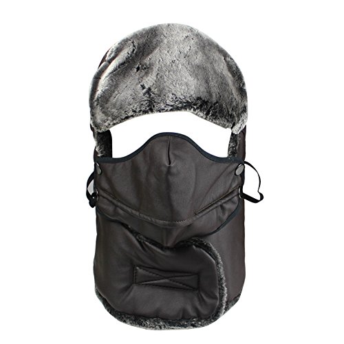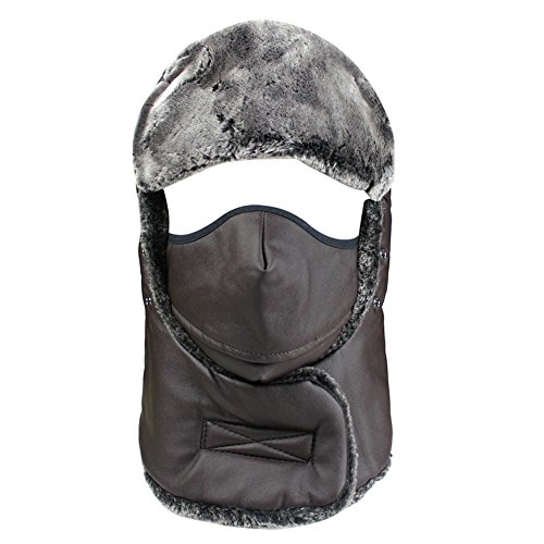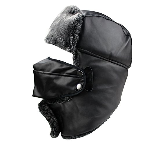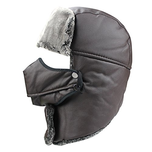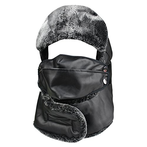 Product Description Mens Winter PU Fleeced Trooper Trapper Hunting Cycling Motocycle Ushanka Russian Hats Hat Cap with Ear Flaps Windproof Facemask Neck Warmer 0