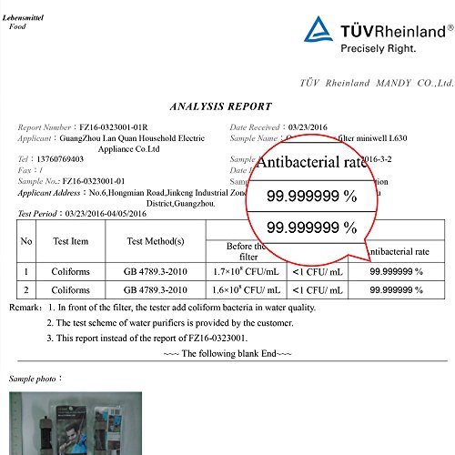 Studio : Guangzhou Lanquan Household Electric Appliance Co., Ltd. Publisher : Guangzhou Lanquan Household Electric Appliance Co., Ltd. Product Description miniwell L630 employs 0.1 micron ultrafiltration membrane(medical grade material) as filter media, which effective against 99.9% the escherichia coli, staphylococcus aureus, salmonella typhi, cholera bacteria, legionella, and other pathogenic bacteria. Good choice for soldiers, hiking, camping, fishing, hunting, climbing, ravel, out-door work, survival, emergency and refugee and rescuer in earthquake or flood area etc. And it is also an affordable source of drinking water for people who live in the conflict area, riot area, remote village and tribe. 0