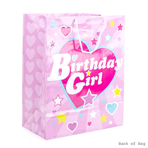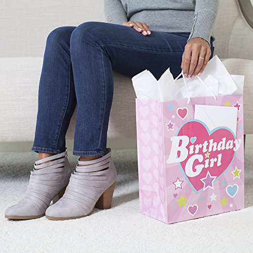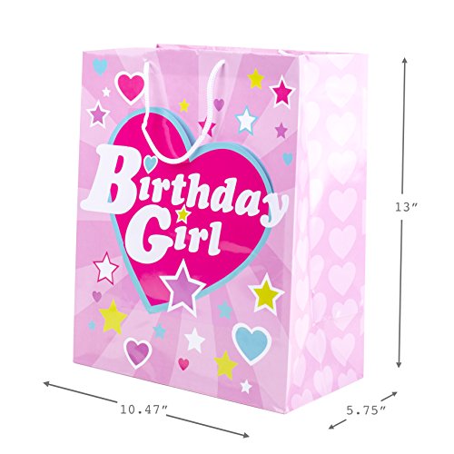 Studio : Hallmark Publisher : Hallmark Binding : Kitchen Product Description This bright and fun gift bag features pastel stars and hearts and the words "Birthday Girl" in vintage-style lettering. It comes complete with a white cord handle, white tissue paper, and a greeting card that reads, "May your birthday sparkle!" This gift bag features an innovative, patent-pending exterior card pocket. Purchase includes one large bag, three sheets of white tissue paper, and a card with an envelope that's perfect for any birthday girl. This large gift bag measures 10.47 inches wide by 13 inches high by 5.75 inches deep and can hold books, clothing, stuffed animals, puzzles, or fashion dolls. Created with high-quality paper materials, all Hallmark gift bags are made with paper from well-managed forests. 0