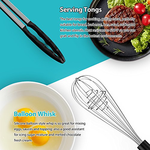 Binding : Kitchen Product Description Why use the combination material of Stainless steel and Silicone?PREMIUM STAINLESS GRIPUnlike plastic and wooden kitchen utensils, stainless-steel construction is non-toxic, rustproof, and easy to clean, it offers long lasting performance.SILICONE HEADAs an Eco-Friendly material, Silicone can withstand temperatures up to 500°F, allowing reaching into boiling water.Designed ergonomically, what are the 10 pieces used for? Basting Spoon: Shaped perfectly for stirring and basting; Excellent reach in deep pots and wide pans;Silicone Ladle: Perfect for portioning out soups, stews, chili and more;Silicone Skimmer Spoon: Long length of grip protects you from burns and scalds, allowing you to safely scoop scalding-hot French fries and pasta from boiling grease or water;Slotted Spatula: Soft enough to bend to scrape the bottom of pans, yet firm enough to lift up fish and eggs. Perfect for flipping burgers, pancakes, and more;Butter Spatula: The smooth edges won’t scratch non-stick pans, perfect for spreading frosting or scraping out mixing bowls;Spaghetti Server: Perfect for angel hair, linguini other pasta, never slip off, quickly drains excess water from pasta before serving;Balloon Whisk: Silicone balloon style whip is so great for mixing eggs, sauces and topping; also a good assistant for icing sugar mixture and melted chocolate fresh cream;Serving Tongs: The best tongs for cooking, grilling meat, perfectly suitable for bread, BBQ, salad, snake and kitchen utensils;Spatula Rest: Helps keep stoves and counters clean; Large enough to fit all sizes of spoons, spatulas, utensils, ladles, silverware; Provides a stable place to rest spoons. 0