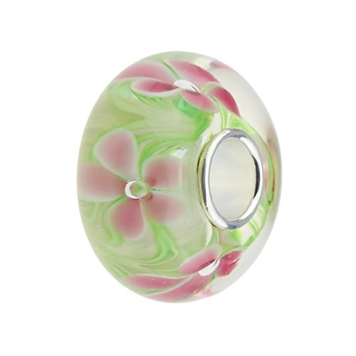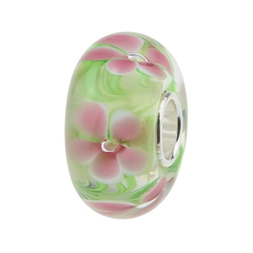 PINK FLOWERS ON A GREEN FIELD MURANO GLASS BEADS CHARMS LAMPWORKS BLOWN HANDMADE FASHION JEWELRY