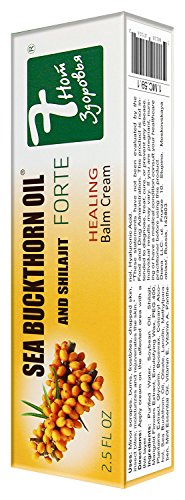 This healing cream-balm contains 8 active ingredients: Sea Buckthorn oil, Shilajit, Marigold Flowers Extract, Plantain extract, vitamin E, vitamin A, Panthenol and Hyaluronic Acid. Sea buckthorn has a long history of use in folk medicine, dating back thousands of years. Tibetan doctors during the Tang dynasty used it to help relieve various health problems. With so many uses it's hard to find anyone who can't benefit from this product. Sea buckthorn oil is well-known today for its healing and rejuvenating effects on the skin. When used topically, it's a great natural cleanser and exfoliator. It can also help with minor burns, cuts, wounds, sunburn, rashes, and other types of skin damage. Using sea buckthorn oil daily helps slow down the signs of aging by nourishing the tissues in your skin and body. In Sanskrit, the word shilajit means rock like, in reference to shilajit's benefit powers to "make our body like a rock," protected from the ravages of time. In Ayurvedic medicine, shilajit has been used for thousands of years to promote longevity and anti-aging. Shilajit benefits are also considered as a master rejuvenator because it works to strengthen each cell in the body. Marigold (Calendula) has been considered beneficial in reducing inflammation and promoting wound healing. Plantain has been used for insect and snake bites, and as a remedy for rashes and cuts. Hyaluronic Acid improves skin texture and brightness with intense moisture and balance.*Feature
