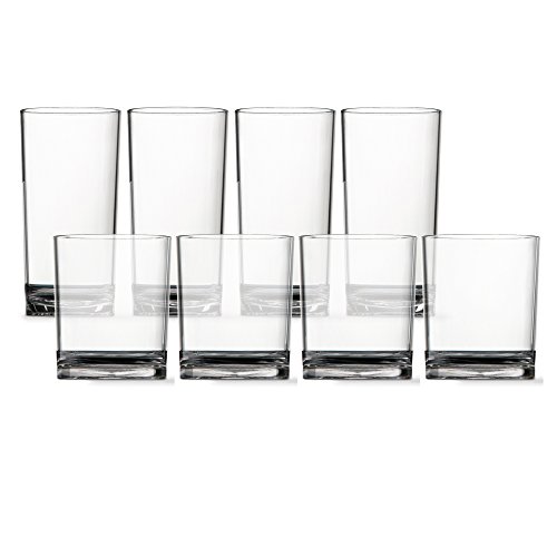 Set includes four 14-ounce rocks tumblers and four 18-ounce water tumblers. The crystal-clear design makes them look like glass but they are made of unbreakable Tritan material. Their versatility will compliment any table setting. Elegant for formal dinner parties and casual for everyday use. Great for backyard and poolside parties. Does not break when dropped! Top rack dishwasher safe. BPA-free. Made in USA.Feature