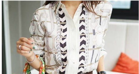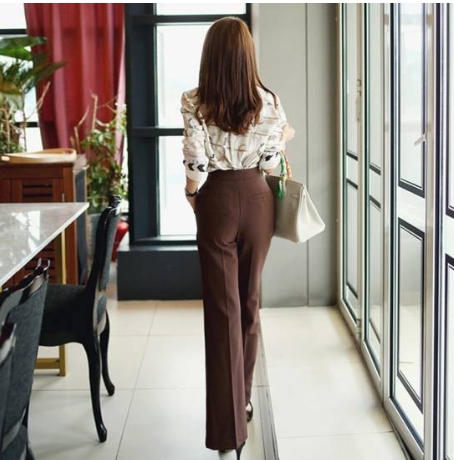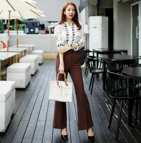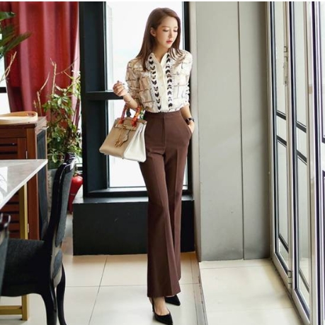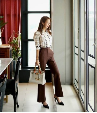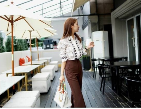 顔周りを明るく見せてくれそうなプリントシャツと、ブラウンのセンタープレスパンツです。