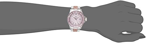 -. Feature : Date window at 3:00 / Pink textured dial with silver tone hands, silver tone and white Swarovski crystals hour markers; stainless steel bezel encrusted with pink Swarovski crystals; flame fusion crystal; stainless steel case and bracelet with pink resin center links / Swiss-quartz movement / Case diameter: 38mm / Water resistant to 330 feet