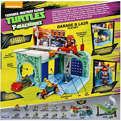 -. Binding : Toy -. Brand : Teenage Mutant Ninja Turtles -. EAN : 0885152895755 -. Feature : Utilizing Kraang Power Cell technology, Shredder and the Foot Clan are on the loose, terrorizing the city with hi-tech battle-ready vehicles; Team Green answers back and the Turtles develop their own powerful line of T-Machines to save the streets of New York; Grab your Shell and Roll / Includes exclusive Raph in T-Rawket / Features Garage door launcher / Lift to Street Level! 2 Levels of Play! Surface Street Level, Sewer Tunnel, & Underground Lair / Connect this set to other T-Machine sets -. IsAdultProduct : 0 -. ItemPartNumber : 97876 -. Label : Teenage Mutant Ninja Turtles -. LegalDisclaimer : CHOKING HAZARD! Contains small pieces. Not suitable for children 5 years old and younger. -. Manufacturer : Teenage Mutant Ninja Turtles -. Model : 97876 -. MPN : 97876 -. NumberOfItems : 1 -. PackageQuantity : 1 -. PartNumber : 97876 -. ProductGroup : Toy -. ProductTypeName : TOYS_AND_GAMES -. Publisher : Teenage Mutant Ninja Turtles -. Studio : Teenage Mutant Ninja Turtles -. Title : Teenage Mutant Ninja Turtles T-Machines Turtle's Garage and Lair Playset -. UPC : 719040140972 -. Warranty : No Warranty
