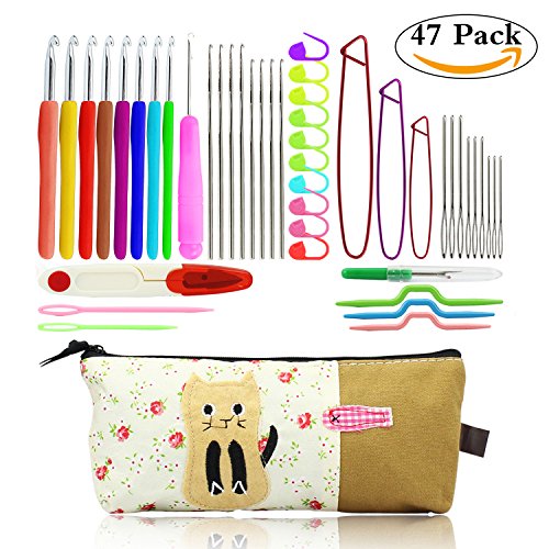 Crochet Hooks Ergonomic Crochet Hook Set with Case Plus Large-Eye Blunt Needles Yarn Knitting,Scissors,Locking Stitch Marke and Other Crochet Tools,Best Gift(47 Pieces)