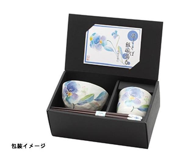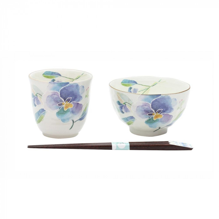 淡いパンジーが鮮やかな飯碗・湯呑・天宝箸のセット。大切な方へのギフトにも最適です。