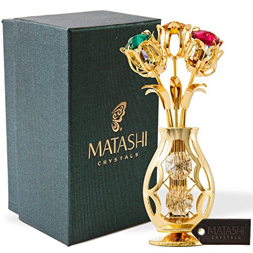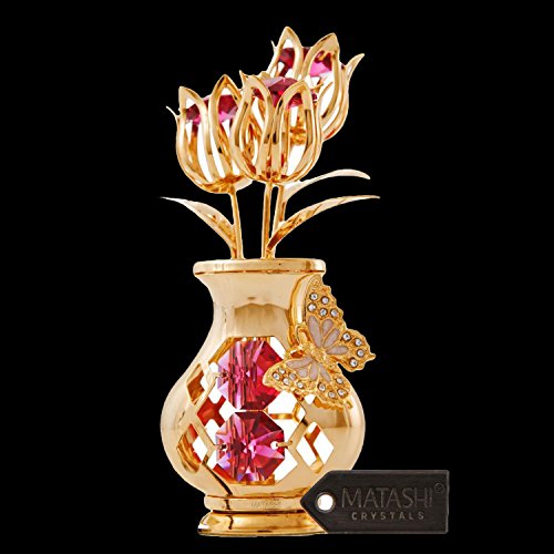 EYE-CATCHING DESIGN: 3 gold tulips reach towards the sun from within a curvy table top vase with a Butterfly figurine perched on the side; Crafted with 24K Gold and studded with precision cut Matashi® Crystals you can be sure of the highest quality materials