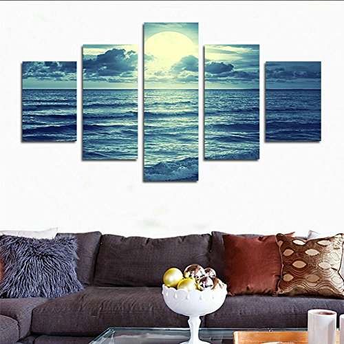 -. Title : H.COZY 5 Piece Blue P.R.Int of the waves of the sea sunset image modern landscape painting seascape modular room wall home decor Canvas P.R.Int art (No Frame) Unframed far140 50 inch x30 inch