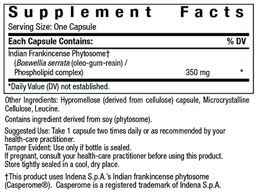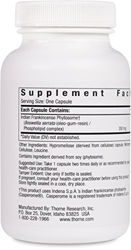 -. Feature : Boswellia bound to phospholipids for enhanced absorption / Three- to seven-fold higher levels of boswellic acids in plasma due to phytosome technology / Supports a healthy balance of inflammatory cytokines in the respiratory tract, GI tract, brain, and musculoskeletal system / Contains a full spectrum of boswellic acids / Does not contain dairy, corn, egg, peanuts, yeast, sugar, magnesium stearate, binders, coatings, disintegrants, artificial colors, artificial flavors, or artificial sweeteners. Thorne Research, Inc. does not make any products that contain Genetically Modified Organisms (known as GMOs).