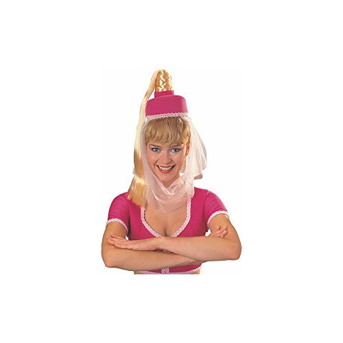 -. Feature : I Dream of Jeannie pink hat with attached sheer veil, and attached blond ponytail with braided accent / One size fits most