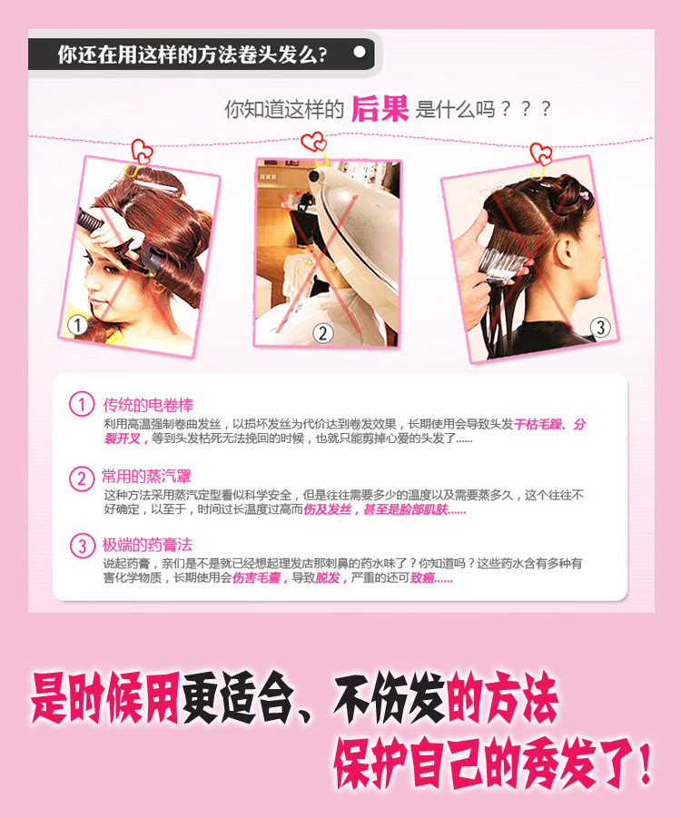 [使用方法]1. 洗头后,待头发6,7分干状态时卷,或未洗头状态可将头发梳顺后喷少许水使头发柔顺再卷。 2.取适量发丝,将发丝均匀卷在发卷表面,卷好亦可用发夹进行加固效果更佳,亦可用吹风机将头发吹干加速定型。3.卷的时间越久效果越好,最好半小时以上,折下发卷,轻轻梳理一翻,秀发即刻展现自然波浪卷。4.取下发卷后亦可喷些定型水等辅助用品,延长效果维持的时间。