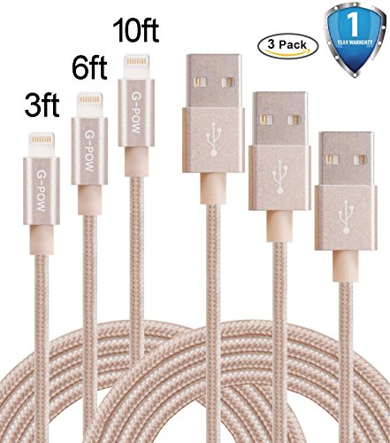 G-POW 3ft 6ft 10ft Nylon Braided Lightning Cable USB Cord Charging Cable for iphone 6s, 6s plus, 6plus, 6,5s 5c 5,iPad Mini, Air,iPad5,iPod. Compatible with iOS9.(Gold)