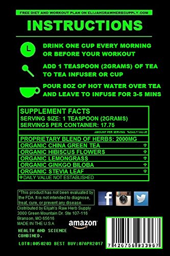 -. Binding : Health and Beauty -. Brand : ERHS -. Department : detox -. EAN : 7426756933967 -. Feature : THE ULTIMATE FAT BURNER GREEN TEA - Made with 100% Certified Organic ingredients with no artificial colors, flavors, sweeteners, or other ingredients added. 100% pure raw herbs. / THE BEST SKINNY GREEN TEA EVER! - Made with Certified Organic Green tea which is loaded with EGCG, Antioxidants, and Caffeine. Certified Organic Lemongrass makes you feel less hungry before meals and aids in digestion and is a great soda-pop replacment because of its delicious flavor! Certified Organic Ginkgo Biloba is known for its energy, memory, and circulation giving properties. / ULTRA SKINNY FORMULA - Scientifically designed to maximize your weight-loss, give you more energy, and give you that flat tummy you've always wanted! Certified Organic Hibiscus provideds Hydroxycitric acid (HCA) which is used in many fat burning formulas (Hydroxycut) and adds a natural fruity flavor! Certified Organic Stevia Leaf is rich in Chromium which helps you burn sugars more effectively and is zero calorie. / WORKS NATURALLY WITH YOUR BODY - 100% Certified Organic pure raw herbs are whole and complete. They will not leave you with side effects or imbalances and are readily absorbed. According to the December issue of The American Journal of Clinical Nutrition population-based studies show that habitual tea drinkers have lower Body Mass Indexes (BMIs) and waist-to-hip ratios and less body fat than non-tea drinkers. / MOTHER NATURE DELICIOUS! - With sweet flavors and aromas of Hibiscus and Lemongrass and the all natural sweetness of 0 calorie Stevia Leaf. This tea is sure to appease even the most delicate palate. -. IsAdultProduct : 0 -. Label : Elijah's Raw Herb Supply -. LegalDisclaimer : ALLERGY ALERT: Safety Info: Hibiscus may be intercropped with peanuts. May contain peanuts or shell fragments.This product has not been evaluated by the FDA. It is not intended to diagnose, treat, cure, or prevent and disease. Pregnant women or breast feeding woman should not use this product. People sensitive to caffeine should not use this product. May contain peanuts or shell fragments. Always consult with your doctor or health physician before starting any new diet, supplement, or workout routine. -. Manufacturer : Elijah's Raw Herb Supply -. MPN : 0050203 -. PackageQuantity : 1 -. PartNumber : 0050203 -. ProductGroup : Health and Beauty -. ProductTypeName : HEALTH_PERSONAL_CARE -. Publisher : Elijah's Raw Herb Supply -. Studio : Elijah's Raw Herb Supply -. Title : ERHS SKINNY TEA: Green tea (EGCG), Fat Burning, Energizing, Detoxifying, Cleansing, Ultra Slimming, Weight loss, Digestive Aid, Reduce Bloating, and Appetite Suppressant.