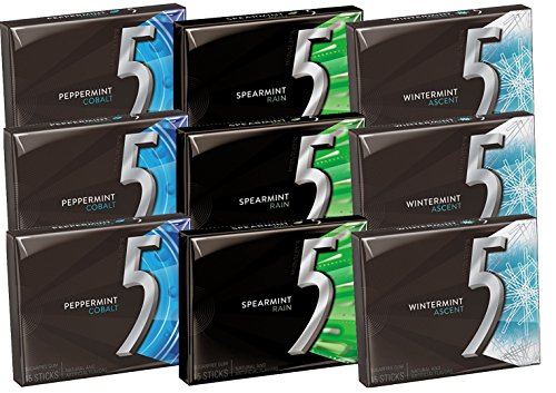 Wrigley' 5 Sugar Free Chewing Gum 15 sticks (Pack of 9) Variety Pack of Candy with 3 Flavors (Peppermint Cobalt, Spearmint Rain, Wintermint Ascent)